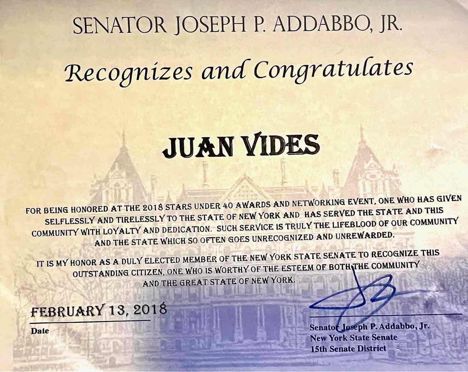 During High School, Juan learned about the electoral process. He was so motivated by the power of the vote that he encouraged his parents to begin with him the process of becoming an American citizen. When he was 16 years old, Juan Vides became a citizen of the United States.