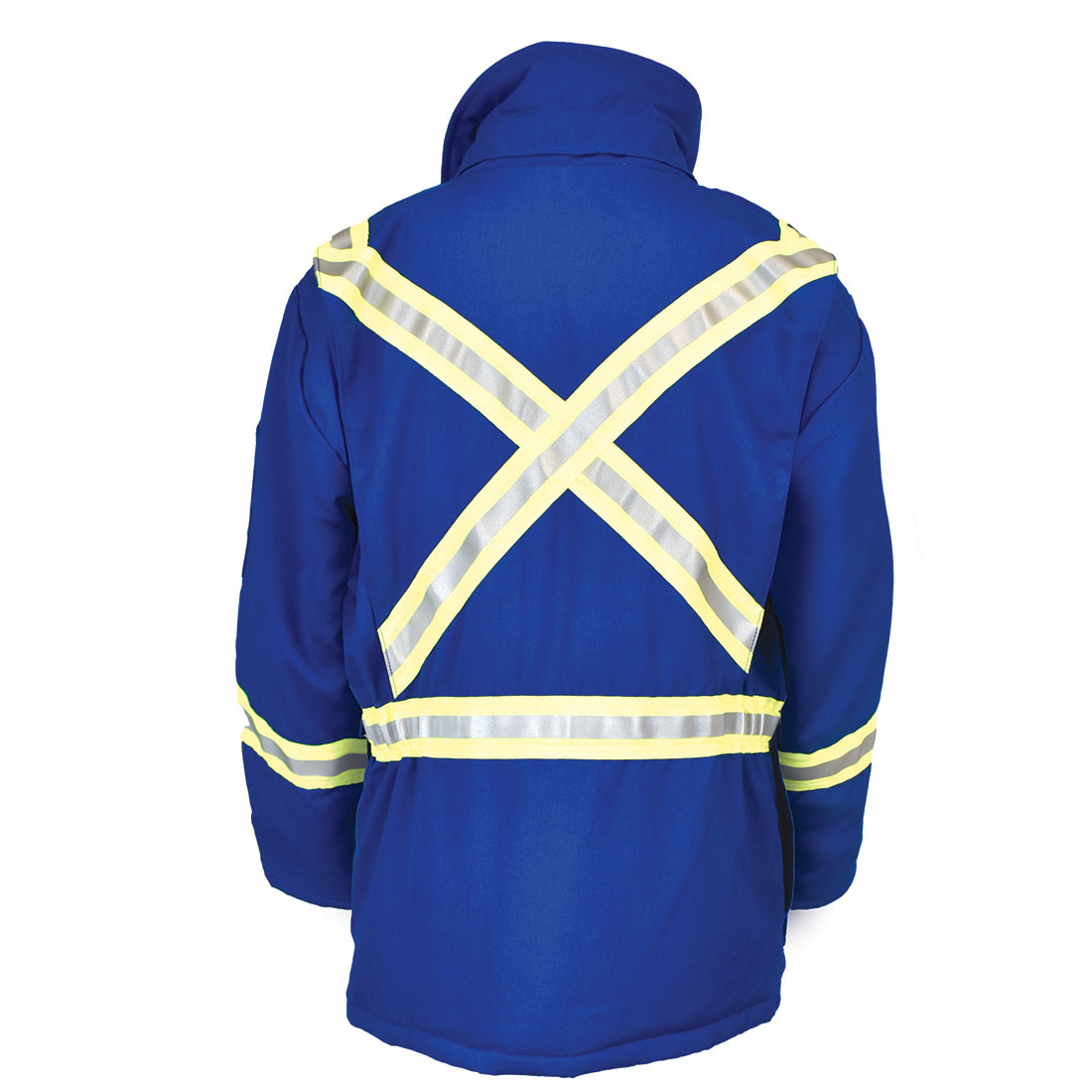 The tall parka features 14oz FR modacrylic insulation throughout extended length, wind and vapor barrier, reflective X-back striping proportioned for tall sizing, concealed hood, adjustable cuffs at extended sleeve length, FR fleece-lined pockets positioned for taller workers, heavy-duty two-way zipper, and lowered striping for logo placement.